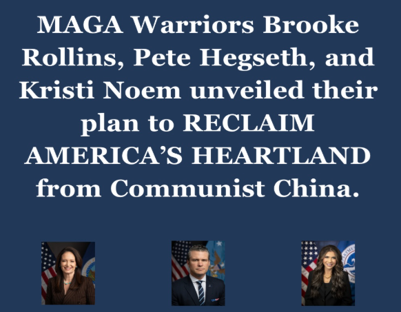 House Republicans via Team Scalise released this message: MAGA Warriors Brooke Rollins, Pete Hegseth, and Kristi Noem unveiled their plan to RECLAIM AMERICA’S HEARTLAND from Communist China. This is a BIG deal. No Administration has had the guts to stand up to Communist China like this before. For years, Radical Democrats looked the other way and sold our country out to the highest bidder. Biden even filed legal action to ALLOW Chinese nationals to expand their grip on our farmland.
