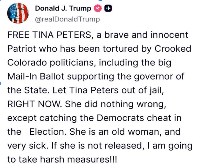 Ps Ioan – Tina Peters is not well.. She is sick. They keep her in a cell at freezing temperatures. President Trump made a statement, “if she is not released, I’m going to take harsh measures.” Evil people want to make her a martyr. Let us pray corporately.